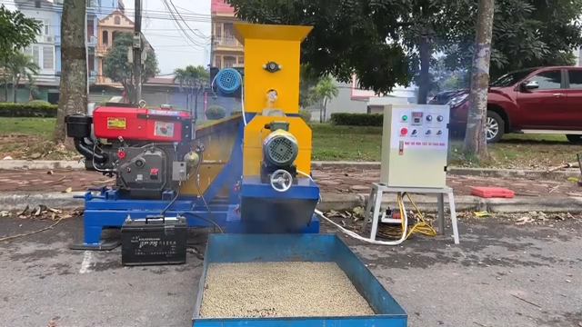 Máy đùn viên thức ăn nổi sử dụng công nghệ ép đứng, nén viên thức ăn dưới áp lực và nhiệt độ cao. Sau khi ra khỏi khuôn ép, viên cám sẽ được làm chín và dãn nở, giúp chúng nổi lâu trên mặt nước từ 6 đến 8 giờ, đảm bảo hiệu quả chăn nuôi.