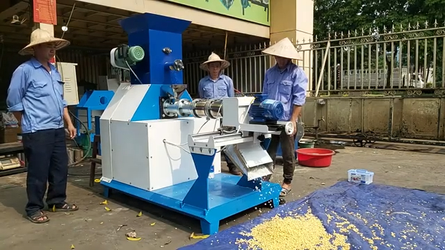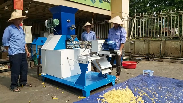 Về cơ chế hoạt động, máy vận hành theo nguyên lý tự động. Nguyên liệu sẽ được nạp từ phễu cấp liệu xuống đầu ép. Bên trong đầu ép là trục xoắn dài khoảng 1 mét, có nhiệm vụ nén và đẩy nguyên liệu tiến dần về phía trước. Trong quá trình này, nguyên liệu sẽ được ma sát và gia nhiệt nhờ hai bộ phận gia nhiệt hiện đại, giúp nguyên liệu chín đều trước khi được đùn ra ngoài. Khi nguyên liệu đạt độ chín cần thiết, chúng sẽ được đùn qua mặt sàng và dao cắt sẽ cắt thành từng viên cám tròn đều.