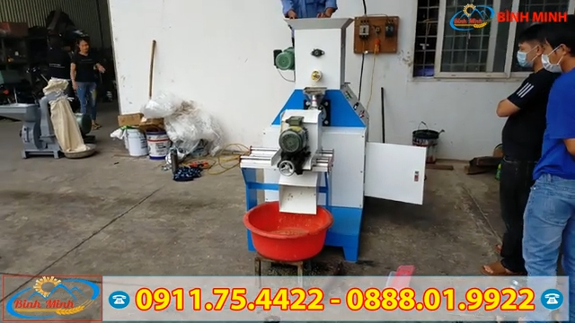 Trong quá trình sản xuất cám viên, việc phối trộn nguyên liệu cũng là một khâu quan trọng. Nếu thực hiện thủ công sẽ tốn nhiều thời gian, công sức và khó đảm bảo độ đồng đều. Vì vậy, sau khi được nhân viên tư vấn, khách hàng đã lựa chọn thêm máy trộn đứng 7.5kW. Đây là dòng máy chuyên dùng để trộn nguyên liệu với năng suất mỗi mẻ có thể đạt khoảng 50 kg và chỉ mất khoảng 2–3 phút để trộn đều. Máy sử dụng động cơ 7.5kW với nguồn điện 3 pha 380V, rất phù hợp cho các cơ sở sản xuất cám quy mô vừa và lớn. Do khoảng cách địa lý xa nên khách hàng không thể trực tiếp đến xưởng để nhận máy. Vì vậy, Công ty Bình Minh đã tổ chức buổi bàn giao máy thông qua hình thức quay video và gửi cho khách hàng theo dõi từ xa. Với công thức phối trộn phù hợp, khi sử dụng máy đùn viên của công ty, các nguyên liệu sẽ được nấu chín trong quá trình ép viên. Nhờ đó cám viên nổi có thể nổi trên mặt nước trong thời gian dài từ 4 đến 6 giờ, giúp cá và các loại thủy sản có đủ thời gian ăn, tránh tình trạng dư thừa hoặc thiếu thức ăn.
