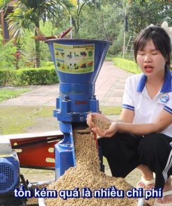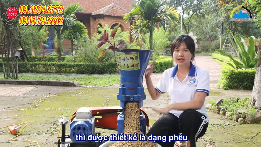 Nguyên liệu được chứa trong phễu với sức chứa khoảng 5–7kg/mẻ. Buồng làm việc được làm bằng gang dày 5 ly, bên trong gồm 4 quả lô được tôn nhiệt cao tần theo dây chuyền hiện đại, giúp ép được cả nguyên liệu thô to như tôm, cá, cua, óc… nếu cần có thể băm nhỏ trước khi ép. Sau khi ép, cám viên đi qua lỗ mặt sàng với kích thước đồng đều và ra cửa xả, kèm theo con dao giúp điều chỉnh độ dài và độ dày của viên cám. Viên cám ra chắc chắn, đẹp, có thể cho vật nuôi ăn ngay hoặc mang đi phơi.