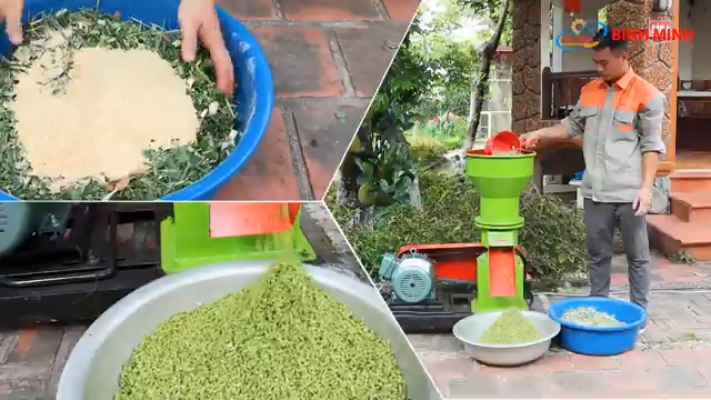 Ở phía sau đây là máy ép cám viên S200. Dòng máy này nhỏ hơn so với S250 mà anh khách hàng sử dụng, tuy nhiên về nguyên lý hoạt động thì khá tương tự. Nhiều bà con cũng thắc mắc rằng S200 có làm được hỗn hợp cỏ nghiền như vậy hay không, nên hôm nay chúng ta sẽ cùng thử nghiệm thực tế. Sau khi cho nguyên liệu vào máy và vận hành khoảng 5 phút, chúng ta đã xử lý xong toàn bộ lượng cỏ vừa chuẩn bị. Bà con có thể quan sát thành phẩm ở đây. Hỗn hợp không ép thành viên cám hoàn chỉnh, nhưng cỏ được nghiền rất tơi, nhỏ và đều, khá giống với kết quả mà anh khách hàng kia đã chia sẻ trên kênh của anh.