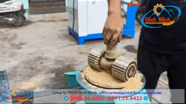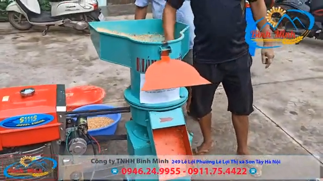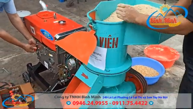 Tại xưởng, kỹ thuật viên tiến hành hướng dẫn anh Riêng chạy thử máy trực tiếp. Bước đầu tiên là cho máy chạy khoảng 3 đến 5kg bột cám gạo để làm trơn mặt sàng, đồng thời lưu ý rằng trong quá trình phối trộn nguyên liệu cần đảm bảo độ ẩm từ 10% đến 20% để cám viên ép ra đạt chất lượng tốt nhất.