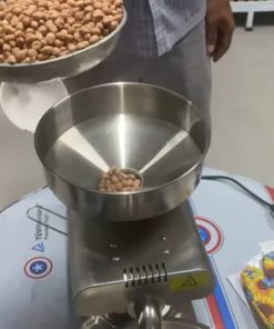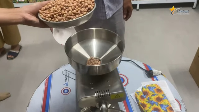Sau khi máy được làm nóng đến nhiệt độ tiêu chuẩn, kỹ thuật tiến hành ép thử trực tiếp 1kg lạc để khách xem khả năng hoạt động thực tế của máy. Lạc được cho vào từ từ để máy ép ổn định, dầu bắt đầu chảy ra dần. Trong quá trình ép, nếu thấy bã chưa khô và còn dầu thì có thể điều chỉnh nhiệt độ phù hợp để đạt hiệu suất cao nhất.
