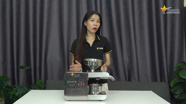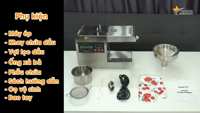 Bộ sản phẩm khi mua bao gồm thân máy, khay hứng dầu, bộ lọc dầu, ống xả bã, chổi vệ sinh, găng tay chịu nhiệt và sách hướng dẫn sử dụng. Máy đã được lắp sẵn trục ép nên người dùng chỉ cần gắn thêm một vài phụ kiện đơn giản là có thể sử dụng ngay. Phía trước máy là bảng điều khiển với nút nguồn và các nút điều chỉnh nhiệt độ để phù hợp với từng loại nguyên liệu khác nhau.