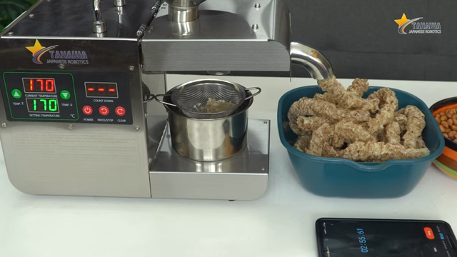 Trong thử nghiệm, người dùng tiến hành ép 1kg đậu phộng để xem lượng dầu thu được. Trước khi ép, đậu được rang sơ để làm khô nguyên liệu, giúp quá trình ép diễn ra thuận lợi hơn và hạn chế tình trạng kẹt máy. Sau đó cắm điện, bật nguồn và cài đặt nhiệt độ khoảng 170°C, nằm trong khoảng nhiệt độ phù hợp từ 160 đến 180°C đối với đậu phộng. Khi máy đạt nhiệt độ cần thiết thì bắt đầu cho nguyên liệu vào để ép.