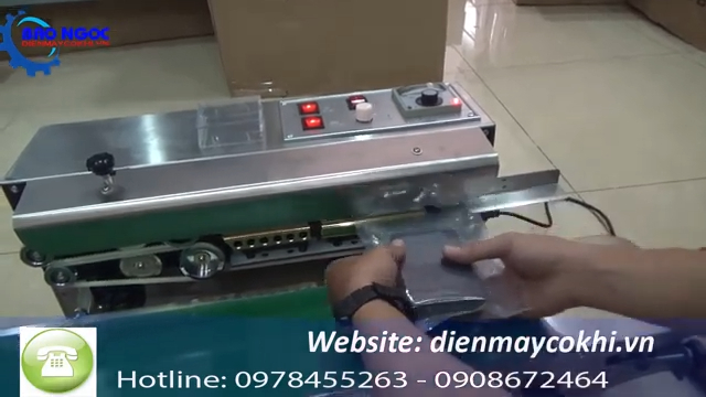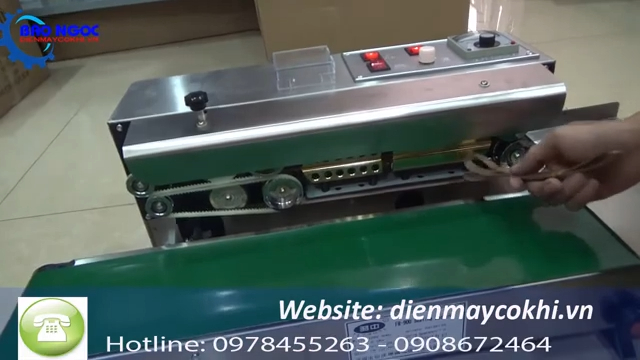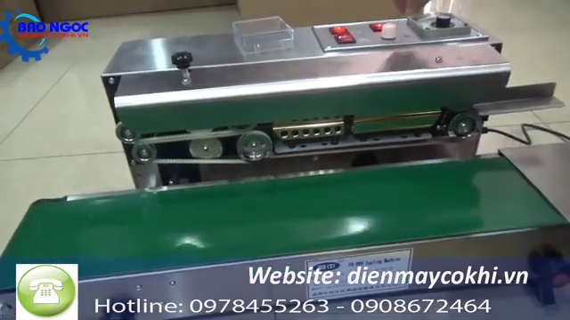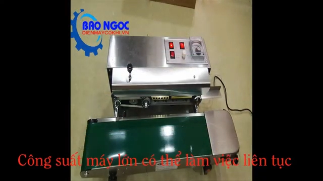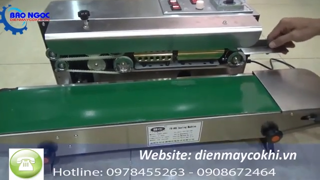 Băng tải của máy được thiết kế linh hoạt, có thể điều chỉnh vị trí gần hoặc xa so với thân máy bằng các núm vặn phía dưới. Sau khi điều chỉnh xong cần siết chặt các núm cố định để đảm bảo băng tải hoạt động ổn định trong quá trình vận hành. Khi cho túi vào máy, người dùng đặt miệng túi lên băng tải và giữ cho túi đi đúng vị trí thanh hàn để đường hàn được thẳng và đều. Nếu trong lúc chạy túi bị lệch, có thể giữ nhẹ để cố định cho đường hàn đẹp hơn.