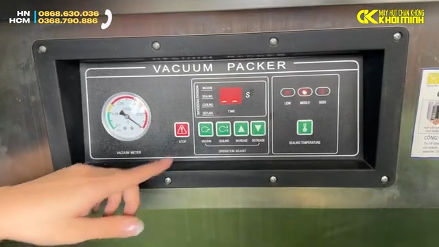 Bảng điều khiển của máy được thiết kế đơn giản với các nút chức năng cơ bản giúp người dùng dễ dàng thao tác. Trên bảng điều khiển có nút bật chế độ hút chân không, nút hàn miệng túi, nút tăng giảm thời gian và nút điều chỉnh nhiệt độ hàn miệng túi. Nhiệt độ hàn thường có ba mức gồm thấp, trung bình và cao, trong đó mức trung bình thường được sử dụng phổ biến để đảm bảo đường hàn chắc chắn và ổn định. Ngoài ra, máy còn có nút dừng để tạm ngưng hoạt động khi cần thiết và đồng hồ đo áp suất để theo dõi lực hút chân không trong quá trình vận hành.