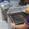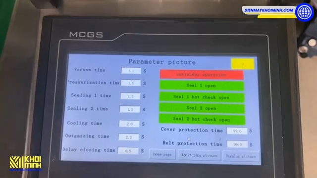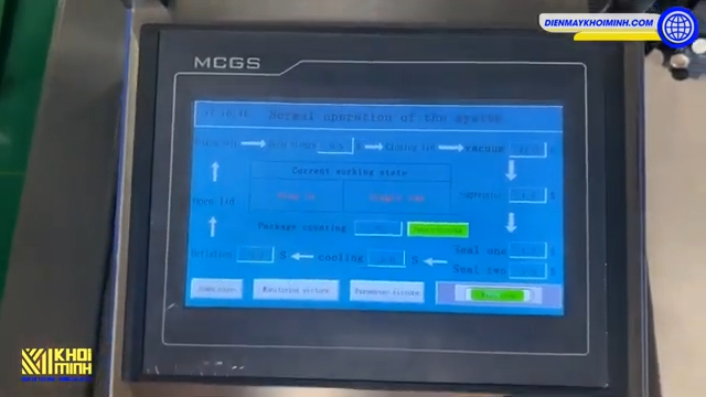 Ngoài ra, trên bảng điều khiển còn có các nút cài đặt thông số như thời gian hút chân không, thời gian hàn miệng túi, thời gian làm mát đường hàn và thời gian mở nắp buồng hút. Người vận hành có thể điều chỉnh các thông số này bằng các nút tăng giảm để phù hợp với từng loại sản phẩm và chất liệu túi. Hệ thống băng tải của máy được thiết kế để đưa sản phẩm đi qua khu vực hút và hàn một cách tự động, giúp tiết kiệm thời gian và giảm công sức lao động.