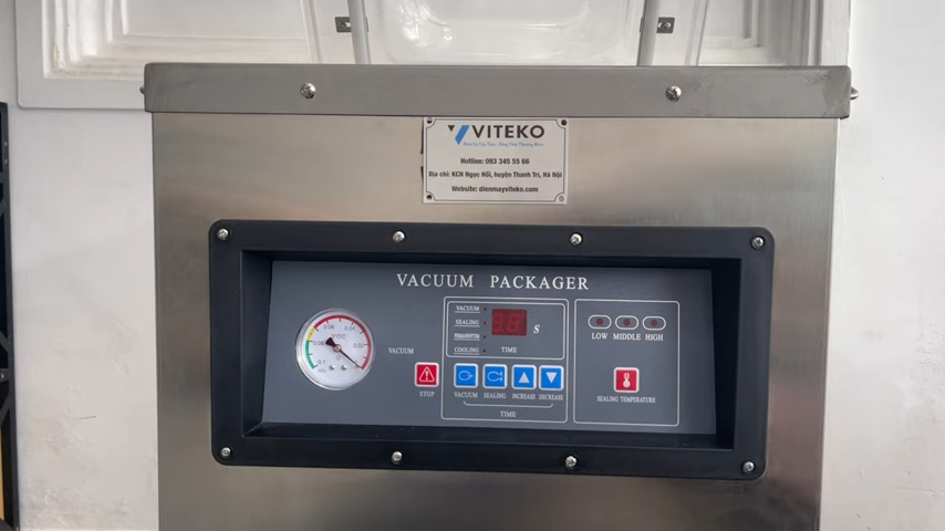 Máy được trang bị bảng điều khiển điện tử đơn giản với đồng hồ hiển thị áp suất hút, nút dừng khẩn cấp, nút hút chân không, nút hàn miệng túi và màn hình LED hiển thị thời gian hút và hàn. Người dùng có thể điều chỉnh thời gian hút chân không và thời gian hàn tùy theo loại thực phẩm. Thời gian hút thực phẩm khô thường khoảng 15 – 20 giây, còn thực phẩm tươi sống dao động 20 – 25 giây. Máy còn có nút điều chỉnh nhiệt độ thanh hàn 3 mức: thấp, trung bình và cao, giúp đảm bảo đường hàn chắc chắn và đẹp mắt.