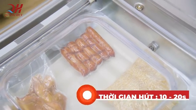 Máy hút chân không công nghiệp có khả năng hút nhanh cùng lúc từ 3 đến 5 túi sản phẩm nhờ công suất động cơ mạnh mẽ, đồng thời tích hợp hai chức năng quan trọng là hút chân không và hàn kín miệng túi. Thời gian hút chỉ khoảng từ 10 đến 20 giây cho mỗi mẻ, lực hút chân không đạt đến 1 Kpa giúp hút kiệt không khí bên trong túi, đảm bảo thực phẩm được đóng gói kín hoàn toàn.
