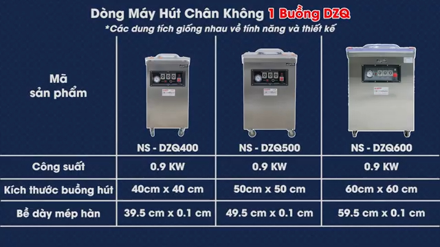 Dòng máy hút chân không một buồng DZQ hiện nay được chia thành nhiều model như DZQ400, DZQ500 và DZQ600. Các model này có thiết kế, màu sắc, công nghệ và tính năng gần như giống nhau, chỉ khác về kích thước buồng hút và dung tích làm việc. Trong đó, máy hút chân không DZQ500 được nhiều cơ sở sản xuất lựa chọn vì kích thước phù hợp, năng suất cao và đáp ứng tốt nhu cầu đóng gói thực phẩm hàng ngày.