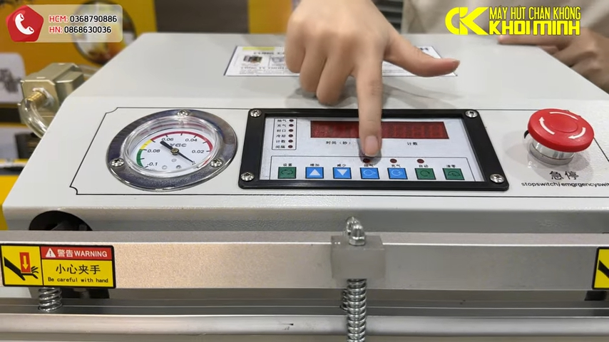 Bảng điều khiển điện tử của máy VS800 rất dễ sử dụng và tích hợp nhiều chức năng. Bạn có thể chuyển đổi giữa các chế độ như hút chân không, bơm hơi khí, hàn miệng túi và làm mắt một cách nhanh chóng. Mỗi chế độ đều có các điều chỉnh riêng biệt, từ thời gian hút chân không đến mức độ bơm hơi khí, giúp bạn dễ dàng tùy chỉnh phù hợp với nhu cầu đóng gói khác nhau.