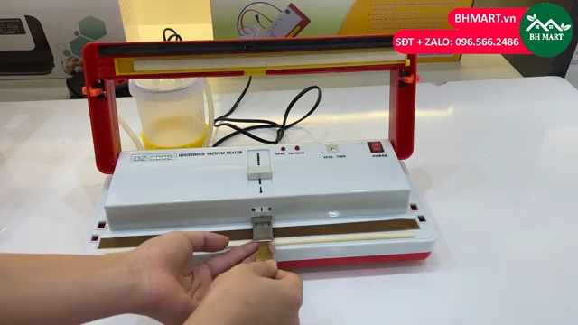 Tiếp theo bạn đặt túi nước ấm vào máy giống như khi hút chân không thực phẩm. Đưa phần nước trong túi sát với vị trí vòi hút rồi đóng nắp máy lại và khởi động máy. Máy sẽ hút nước trong khoảng 2–3 giây là đủ để làm sạch đường hút. Sau đó bạn tắt máy và lặp lại thao tác này thêm một lần nữa với nước ấm.