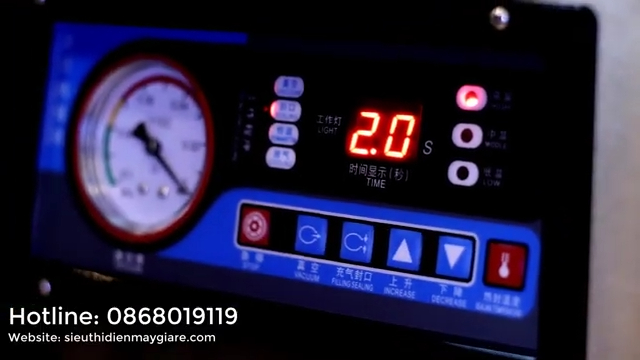 Các nút chức năng bao gồm: nút khởi động, nút dừng khẩn cấp, nút điều chỉnh thời gian hút chân không, nút điều chỉnh thời gian hàn miệng túi, nút tăng giảm giá trị cài đặt và chức năng điều chỉnh nhiệt độ hàn phù hợp với từng loại túi.