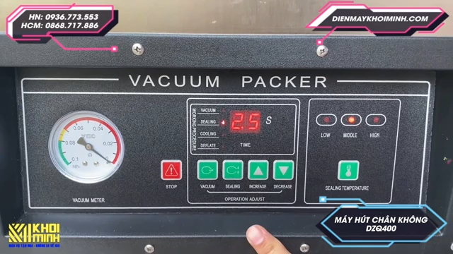 Để vận hành máy hút chân không DZQ400, người dùng cần cài đặt thời gian hút chân không và thời gian hàn miệng túi thông qua bảng điều khiển. Đầu tiên là thời gian hút chân không, thông số này sẽ phụ thuộc vào kích thước túi và loại sản phẩm cần đóng gói. Nếu túi lớn hoặc sản phẩm cần hút chặt thì có thể tăng thời gian hút lên cao hơn. Trong nhiều trường hợp thông thường thời gian hút khoảng 20 giây là đã đạt độ chân không cần thiết.