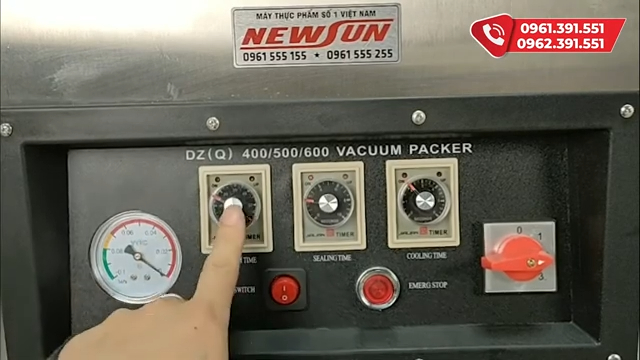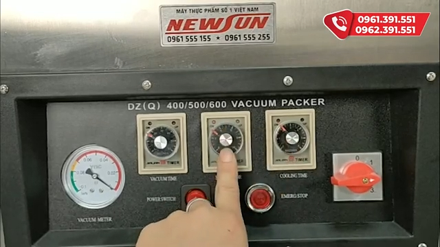 Phần bảng điều khiển của máy được thiết kế trực quan, dễ sử dụng. Bao gồm đồng hồ hiển thị áp suất, núm điều chỉnh thời gian hút chân không từ 7–20 giây tùy loại thực phẩm, núm điều chỉnh thời gian hàn miệng túi từ 2–4 giây, thời gian làm nguội để cố định mối hàn, công tắc điều chỉnh nhiệt độ hàn với nhiều mức từ 0–3, và nút dừng khẩn cấp giúp tắt máy ngay lập tức khi cần thiết.