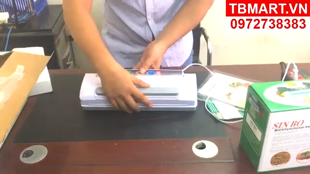 Khi cắm điện, máy sẽ hiển thị mức thời gian hàn. Người dùng có thể điều chỉnh thời gian hàn từ mức 3 đến mức 9 tùy theo độ dày của túi. Thông thường với túi hút chân không đi kèm theo máy thì nên để ở mức 5 hoặc mức 6 để đường hàn được chắc và đẹp. Để sử dụng máy, trước tiên người dùng ấn hai nút mở khóa ở hai bên thân máy để bật nắp lên. Sau đó cho thực phẩm vào túi và đặt miệng túi vào đúng vị trí khe hút của máy, đảm bảo túi nằm thẳng và miệng túi nằm đúng khu vực thanh hàn. Tiếp theo đóng nắp máy xuống và ấn mạnh hai bên để khóa nắp lại.