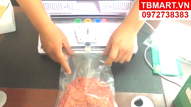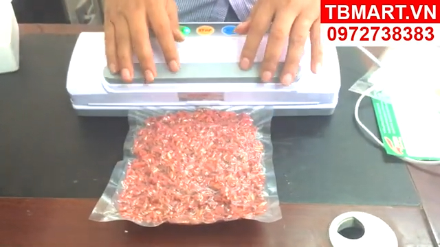 Sau khi đóng nắp xong, nhấn nút hút chân không để máy bắt đầu hoạt động. Máy sẽ tiến hành hút không khí bên trong túi ra ngoài, sau đó tự động hàn kín miệng túi. Trong quá trình hút nên dàn đều thực phẩm bên trong túi để túi phẳng và đẹp, đồng thời tránh để miệng túi bị gấp nếp vì có thể làm đường hàn không kín. Khi đèn báo trên máy tắt, quá trình hút và hàn đã hoàn thành. Lúc này chỉ cần nhấn hai nút hai bên thân máy để mở nắp và lấy túi thực phẩm ra. Túi sau khi hút sẽ ôm sát thực phẩm và đường hàn thường rất chắc chắn.