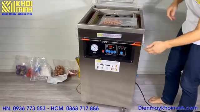 Để sử dụng máy, trước tiên cần cắm nguồn điện phù hợp với điện áp của máy, sau đó mở nắp máy và bật công tắc nguồn ở bên hông. Khi máy đã có điện, bước tiếp theo là tiến hành cài đặt các thông số hoạt động. Trước hết cần cài đặt thời gian hút chân không bằng cách nhấn nút Vacuum, lúc này đèn báo sẽ sáng và người dùng có thể tăng hoặc giảm thời gian hút bằng các nút điều chỉnh. Thời gian hút thường được cài khoảng 12 đến 13 giây tùy theo loại sản phẩm và kích thước túi.
