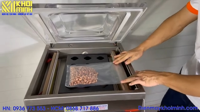 Sau khi cài đặt xong các thông số, người dùng đặt sản phẩm vào túi rồi sắp xếp túi vào trong buồng hút chân không của máy. Miệng túi cần đặt vượt qua vị trí thanh hàn để máy có thể hàn kín sau khi hút xong. Nếu túi mỏng thì có thể giữ nguyên miếng kê bên trong buồng máy, còn nếu túi dày hơn thì có thể tháo miếng kê để tăng không gian. Máy KMVC400-2D có hai thanh hàn nên có thể đặt hai túi cùng lúc để hút và hàn đồng thời, giúp tăng hiệu quả làm việc. Sau khi đặt túi đúng vị trí, hạ thanh chặn xuống để cố định miệng túi và làm phẳng bề mặt túi trước khi hút.