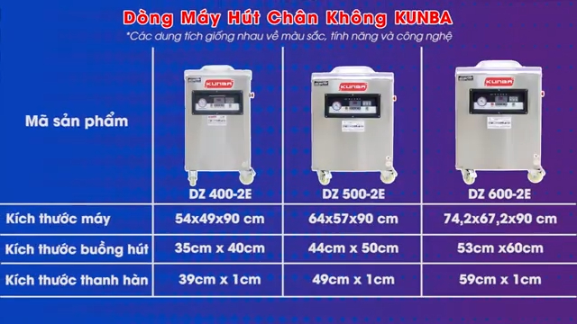 Máy hút chân không Kunba DZ4002E thuộc dòng máy một buồng với ba phiên bản phổ biến: DZ4002E, DZ5002E và DZ6002E. Điểm khác biệt chủ yếu nằm ở dung tích buồng hút và kích thước máy. Dòng máy Kunba có tuổi thọ cao, hoạt động bền bỉ trong nhiều năm và ít xảy ra hỏng hóc, được nhiều cơ sở sản xuất và chế biến thực phẩm tin tưởng lựa chọn.