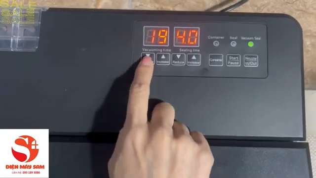 Màn hình bên phải hiển thị thời gian hàn miệng túi, ví dụ cài đặt khoảng 4 giây và có thể điều chỉnh tùy theo độ dày của túi. Ngoài ra, bảng điều khiển còn có các nút chức năng như nút bắt đầu, nút kết thúc và nút điều khiển vòi hút.