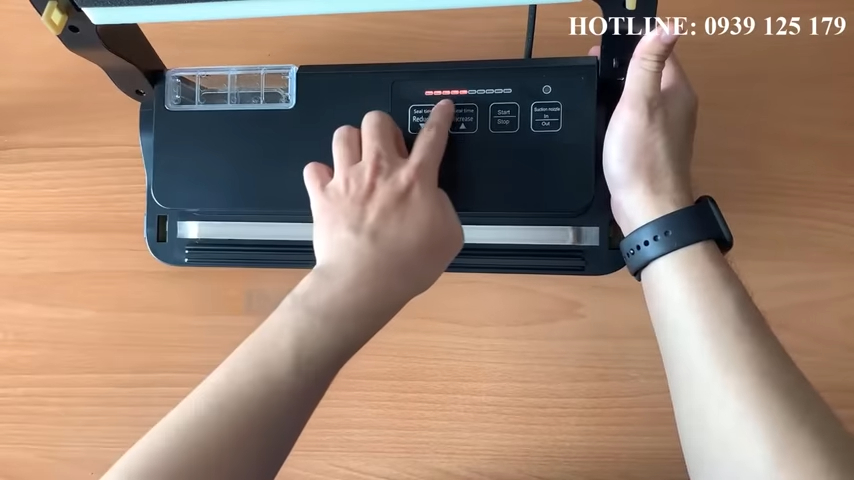 Máy được tích hợp bình chứa nước dung tích 100ml, giúp lọc khí và hút phần nước trong túi ra ngoài, đặc biệt hữu ích với thực phẩm có độ ẩm hoặc nước. Máy còn có 10 cấp độ hàn túi để điều chỉnh nhiệt độ hàn phù hợp với từng loại túi dày hoặc mỏng.