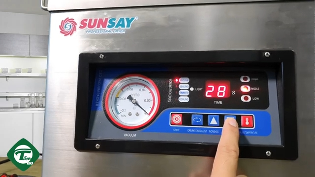 Sau khi khởi động máy, người dùng cần cài đặt hai thông số quan trọng là thời gian hút chân không và thời gian ép miệng túi. Trên bảng điều khiển của máy có các nút cài đặt màu xanh để điều chỉnh thời gian hút chân không. Khi nhấn vào biểu tượng hình tròn, đèn đỏ ở mục Vacuum sẽ sáng và màn hình sẽ hiển thị thời gian hút mặc định khoảng 30 giây. Tuy nhiên thời gian hút này có thể thay đổi tùy theo kích thước bao bì và lượng sản phẩm bên trong túi. Thông thường người dùng có thể cài đặt khoảng 25 đến 27 giây để đạt hiệu quả hút tốt. Các phím mũi tên lên xuống giúp tăng hoặc giảm thời gian hút từng giây để phù hợp với nhu cầu đóng gói.