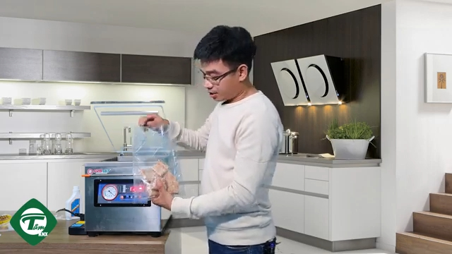 Khi đã cài đặt xong các thông số, người dùng có thể bắt đầu quá trình đóng gói chân không. Trước tiên, cho sản phẩm vào túi đóng gói. Lưu ý rằng lượng sản phẩm trong túi không nên quá ít vì lực hút sẽ không đủ mạnh để ép sát túi, nhưng cũng không nên cho quá nhiều vì sẽ khiến miệng túi bị căng và khó hàn kín. Sau khi cho sản phẩm vào túi, đặt túi vào trong buồng hút chân không của máy.