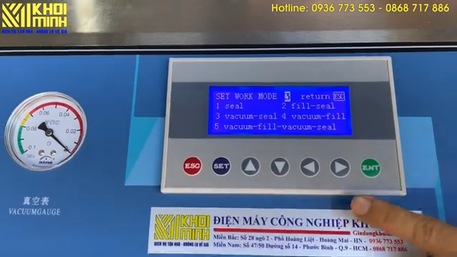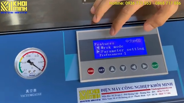 Người dùng có thể cài đặt thời gian hút, thời gian hàn túi, thời gian làm mát và lựa chọn chế độ tự động hoặc bán tự động. Đồng hồ hiển thị áp suất chân không cho phép kiểm tra chất lượng đóng gói, đảm bảo túi chân không đạt yêu cầu. Máy có thể vận hành bằng nút bấm hoặc bàn đạp chân, rất thuận tiện cho việc đóng gói liên tục các sản phẩm lớn.