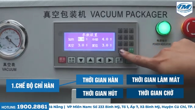 Trong chế độ bán tự động có cài đặt thời gian hút, người dùng có thể thiết lập trước thời gian hút (ví dụ 5 giây), sau đó đặt sản phẩm vào túi và máy sẽ hút theo thời gian đã cài đặt, rồi hàn miệng túi và nhả tay hàn khi hoàn tất.