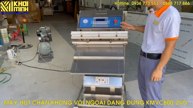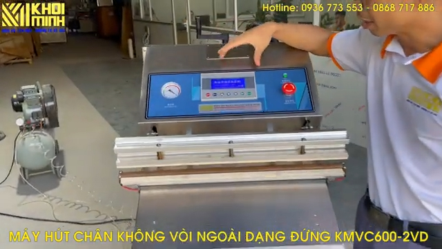 Máy hút chân không vòi ngoài dạng đứng KMVC600-2VD sử dụng hệ thống PLC hiện đại, phù hợp cho các cơ sở đóng gói chuyên nghiệp. Máy có nhiều chế độ làm việc: hút chân không, hàn miệng túi riêng hoặc kết hợp bơm căng khí và hàn.