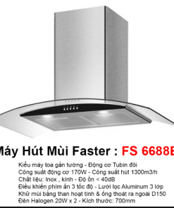 - Máy hút mùi kính Faster FS-3688S: Dòng máy hút mùi kính có công suất hút 1400 m3/h, phù hợp với các căn bếp hiện đại.