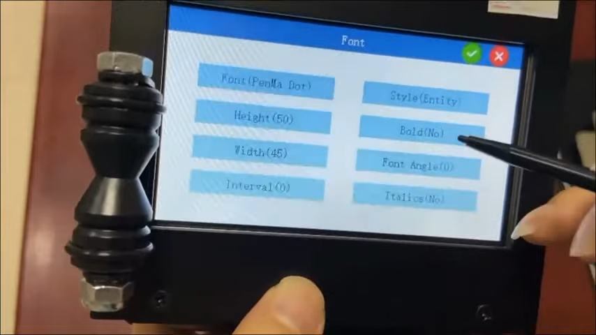 Trên màn hình soạn thảo của máy có các tùy chọn giúp thay đổi kiểu chữ và định dạng chữ. Các bạn có thể chuyển chữ thường sang chữ in hoa hoặc chọn các kiểu chữ khác nhau thông qua mục ABC. Tuy nhiên đối với tiếng Việt thì máy chỉ hỗ trợ chữ không dấu, nghĩa là các bạn có thể viết chữ “tan” nhưng không thể viết các chữ có dấu như “tấn” vì máy không hỗ trợ dấu sắc, dấu hỏi, dấu huyền, dấu ngã hay dấu nặng. Ngoài ra máy cũng hỗ trợ chèn số tự động để đánh số sản phẩm và chèn ngày tháng năm. Tuy nhiên định dạng mặc định của máy theo chuẩn quốc tế sẽ là năm – tháng – ngày nên có thể khác với cách viết ngày – tháng – năm phổ biến tại Việt Nam.