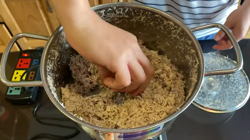 Trước khi sử dụng máy làm ruốc mini, chúng ta cần chuẩn bị thịt đã được chưng chín cùng với gia vị. Sau khi thịt đã chín, chúng ta cho thịt vào trong máy để bắt đầu quá trình đánh bông. Lượng thịt mỗi lần cho vào máy chỉ cần khoảng 2–3 đũa đầy là phù hợp, không nên cho quá nhiều để máy hoạt động hiệu quả hơn.