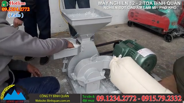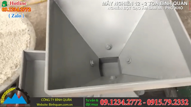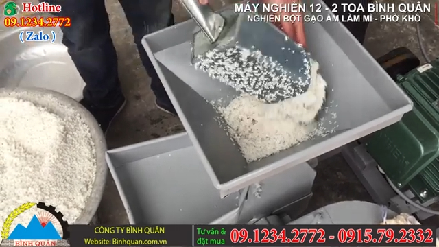 Nguyên liệu được sử dụng trong quá trình nghiền có thể là gạo ngâm để làm bún mì khô, gạo sẽ được ngâm trước khoảng từ 8 đến 10 tiếng, sau khi ngâm đủ thời gian sẽ được vớt ráo nước và đưa vào máy nghiền buồng 12 hai toa để tiến hành nghiền. Máy nghiền buồng 12 hai toa có chức năng nghiền nhỏ các loại nông phẩm như gạo, ngô, khoai, sắn thành dạng cám phục vụ cho gia súc gia cầm với năng suất đạt khoảng 400 đến 500kg mỗi giờ.