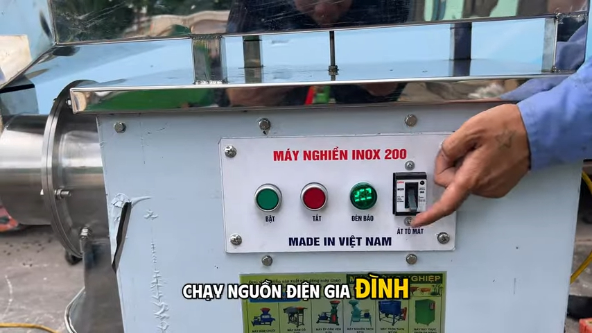 Máy sử dụng nguồn điện gia đình 220V và được trang bị hệ thống điều khiển đơn giản. Khi kết nối với nguồn điện, đèn báo sẽ hiển thị để người dùng kiểm tra nguồn điện. Sau đó chỉ cần bật aptomat và công tắc là có thể bắt đầu vận hành máy để nghiền nguyên liệu.