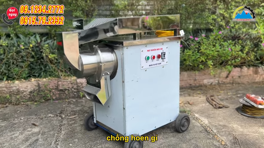 Phía dưới thân máy còn được lắp thêm hệ thống bốn bánh xe giúp việc di chuyển trở nên dễ dàng hơn khi cần thay đổi vị trí đặt máy. Phễu nạp nguyên liệu được thiết kế khá rộng, cho phép người dùng nạp từ khoảng 3 đến 5kg nguyên liệu mỗi lần. Ngoài ra, tại cửa nạp còn có thanh chắn giúp điều chỉnh lượng nguyên liệu chảy xuống buồng nghiền một cách ổn định, tránh tình trạng nguyên liệu xuống quá nhiều gây quá tải cho máy.