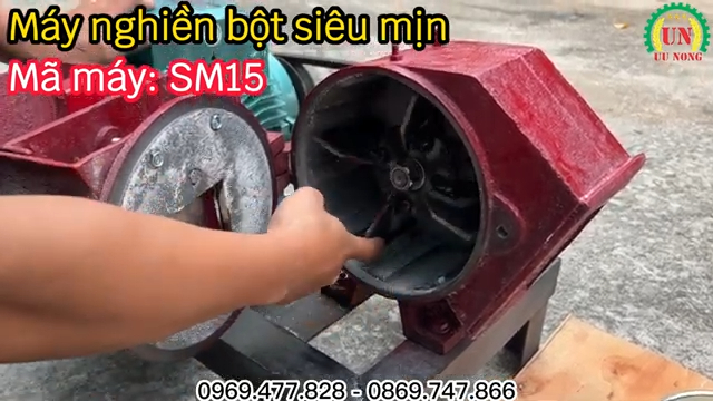 Cửa nạp nguyên liệu thiết kế phía trên giúp đổ nguyên liệu dễ dàng. Nguyên liệu được hút dần vào buồng nghiền và bột ra ở cửa xả bên cạnh. Việc thay sàng cũng rất đơn giản, chỉ cần nới lỏng 4 con ốc cố định trên và dưới phễu, rút sàng cũ ra và lắp sàng mới. Máy gần như được lắp ráp hoàn chỉnh, bà con chỉ cần cắm điện là có thể vận hành ngay.