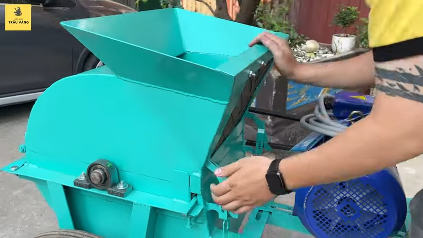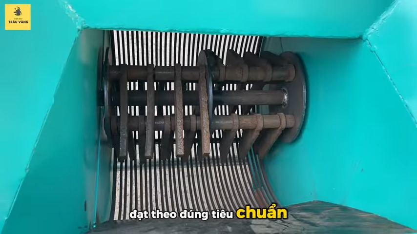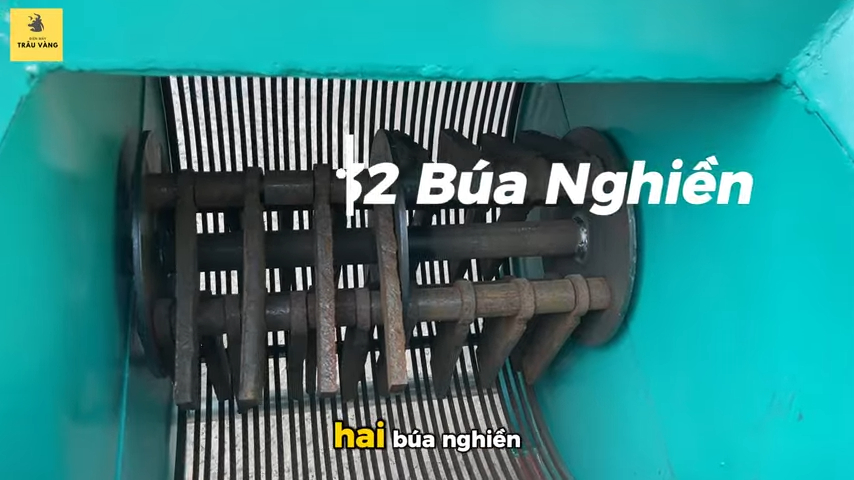 Phần phía trên của máy là phễu nạp nguyên liệu, nơi bà con đưa đất vào để nghiền. Bên trong là buồng nghiền được thiết kế chắc chắn, trong đó có hệ thống búa nghiền gồm nhiều thanh búa dạng dẹp giúp đập nhỏ đất nhanh chóng. Các búa nghiền có chiều dài khoảng 18cm và độ dày khoảng 10mm, đủ mạnh để xử lý các loại đất đồi cứng. Khi máy hoạt động, hệ thống búa quay với tốc độ cao sẽ nghiền nhỏ đất trước khi đưa xuống phần sàng lọc phía dưới.