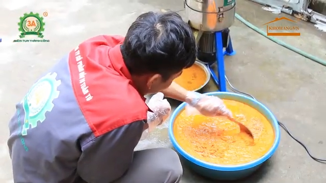 Sau khi được nghiền nhuyễn, hỗn hợp nghệ sẽ thoát ra ngoài theo dòng nước qua cửa xả sản phẩm. Thành phẩm sau khi nghiền có kích thước trung bình khoảng 0,5 – 1mm, với năng suất đạt từ 300 – 400kg nguyên liệu mỗi giờ.