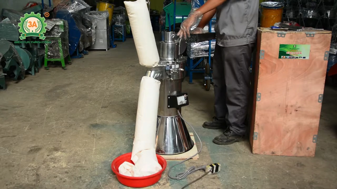 Sau khi nghiền xong, người dùng tắt máy và tiến hành thu bột ở cửa xả.