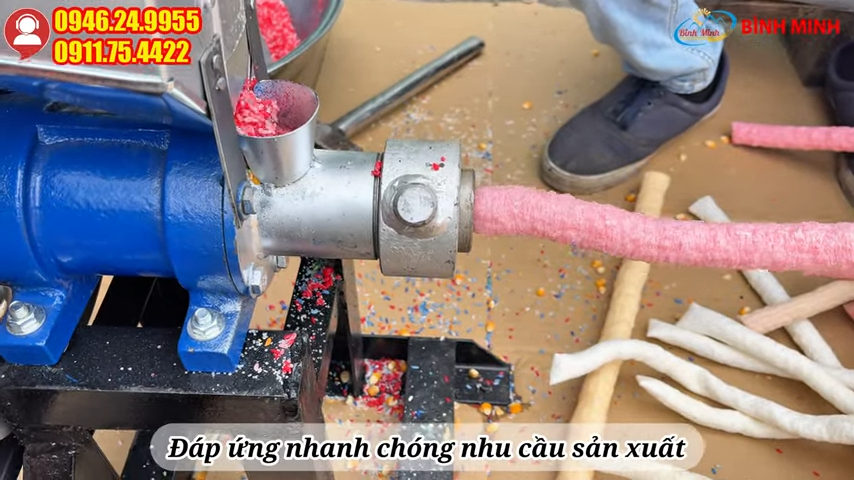 Một ưu điểm khác của dòng máy này là thiết kế đơn giản, dễ vận hành, ngay cả những người mới bắt đầu chưa có nhiều kinh nghiệm cũng có thể sử dụng một cách dễ dàng. Khi mua máy, khách hàng có thể lựa chọn loại ruột bỏng phù hợp như bỏng ống, bỏng gạo, bỏng ngô hoặc nhiều loại bỏng khác. Quá trình vận hành máy cũng rất đơn giản, chỉ cần lắp ruột bỏng vào đầu máy, cố định bằng các bộ phận đi kèm rồi cắm điện và bật công tắc là máy có thể hoạt động. Khi chạy máy lần đầu, nên cho một lượng nhỏ nguyên liệu như ngô hạt vào để máy chạy ổn định trước khi nổ bỏng chính thức. Sau vài chục giây, bỏng sẽ ra đều và đẹp, có thể điều chỉnh độ dài theo nhu cầu, đảm bảo thành phẩm giòn, tơi và không bị gãy vụn.