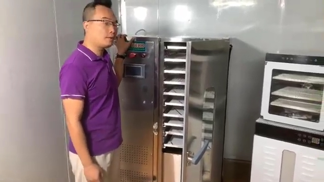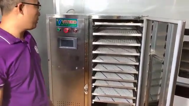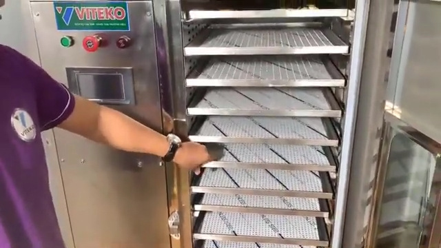 Buồng sấy của máy được thiết kế với khoảng 10 khay sấy, mỗi khay có kích thước khoảng 410 x 520mm. Các khay sấy được làm bằng inox chất lượng cao nên có độ bền tốt, không bị gỉ sét và đảm bảo an toàn vệ sinh thực phẩm trong quá trình sử dụng. Thiết kế nhiều khay giúp người dùng có thể sấy nhiều loại nguyên liệu cùng lúc, từ đó nâng cao hiệu quả sản xuất.