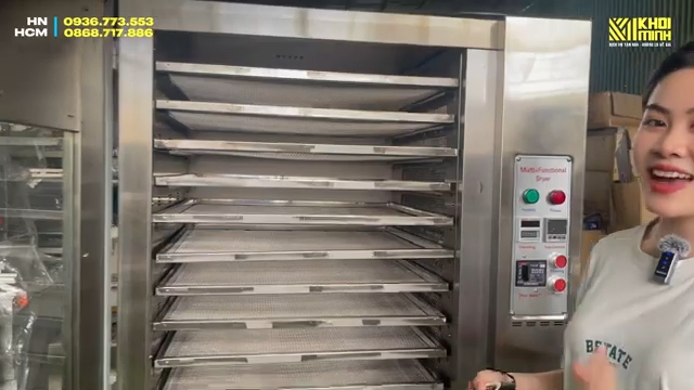 Mỗi khay sấy inox có kích thước khoảng 40 x 40 cm, diện tích khay lớn giúp người dùng có thể đặt nhiều nguyên liệu trong mỗi lần sấy. Tổng cộng máy có 10 khay, vì vậy người dùng có thể tận dụng tối đa diện tích để sấy nhiều loại thực phẩm cùng lúc. Bên dưới máy còn có khay inox hứng nước hoặc hứng dầu, giúp giữ vệ sinh cho máy và hỗ trợ quá trình vệ sinh thiết bị sau khi sử dụng trở nên dễ dàng hơn.