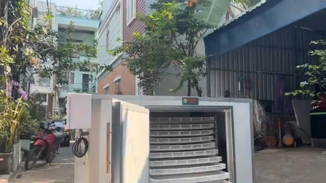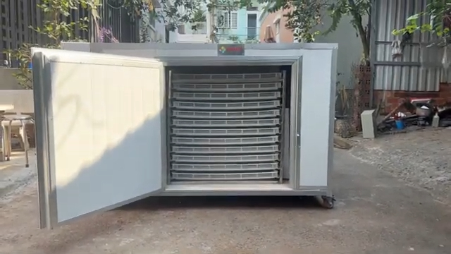 Máy sấy tinh bột nghệ được chế tạo hoàn toàn bằng inox 304 cao cấp, đây là loại vật liệu chuyên dùng trong ngành thực phẩm nên vừa sáng bóng, bền bỉ vừa đảm bảo an toàn và dễ vệ sinh sau mỗi lần sử dụng. Phần khung máy được thiết kế chắc chắn, chịu lực tốt giúp máy vận hành ổn định và bền bỉ trong thời gian dài. Bên trong máy là hệ thống khay sấy được bố trí theo từng tầng với khoảng cách hợp lý để luồng không khí lưu thông đều quanh nguyên liệu. Các khay sấy có thể tháo rời rất thuận tiện cho việc xếp nguyên liệu cũng như vệ sinh máy sau khi sử dụng. Cửa máy được làm bằng inox dày kết hợp kính chịu nhiệt giúp hạn chế thất thoát nhiệt ra bên ngoài và tiết kiệm điện năng trong quá trình vận hành. Bên hông máy là hệ thống quạt gió công suất cao giúp phân phối luồng khí nóng đều khắp các tầng khay, nhờ đó nguyên liệu được sấy khô đồng đều và nhanh chóng. Phía trước là bảng điều khiển với các nút bấm rõ ràng, dễ thao tác, người sử dụng có thể dễ dàng thiết lập thời gian sấy và lựa chọn chế độ phù hợp cho từng loại nguyên liệu khác nhau.