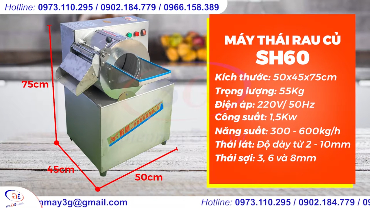 Máy mang mã hiệu M-60, có thiết kế gọn gàng và chắc chắn với kích thước khoảng 50 x 40 x 70cm, trọng lượng khoảng 50kg. Máy sử dụng nguồn điện 220V – 50Hz, công suất 1.5kW, đáp ứng tốt nhu cầu sơ chế rau củ với số lượng lớn. Máy có thể thái lát với độ dày từ 2 đến 10mm và thái sợi với kích thước 3, 6 hoặc 8mm, giúp người dùng linh hoạt trong quá trình chế biến.