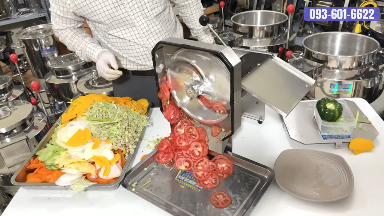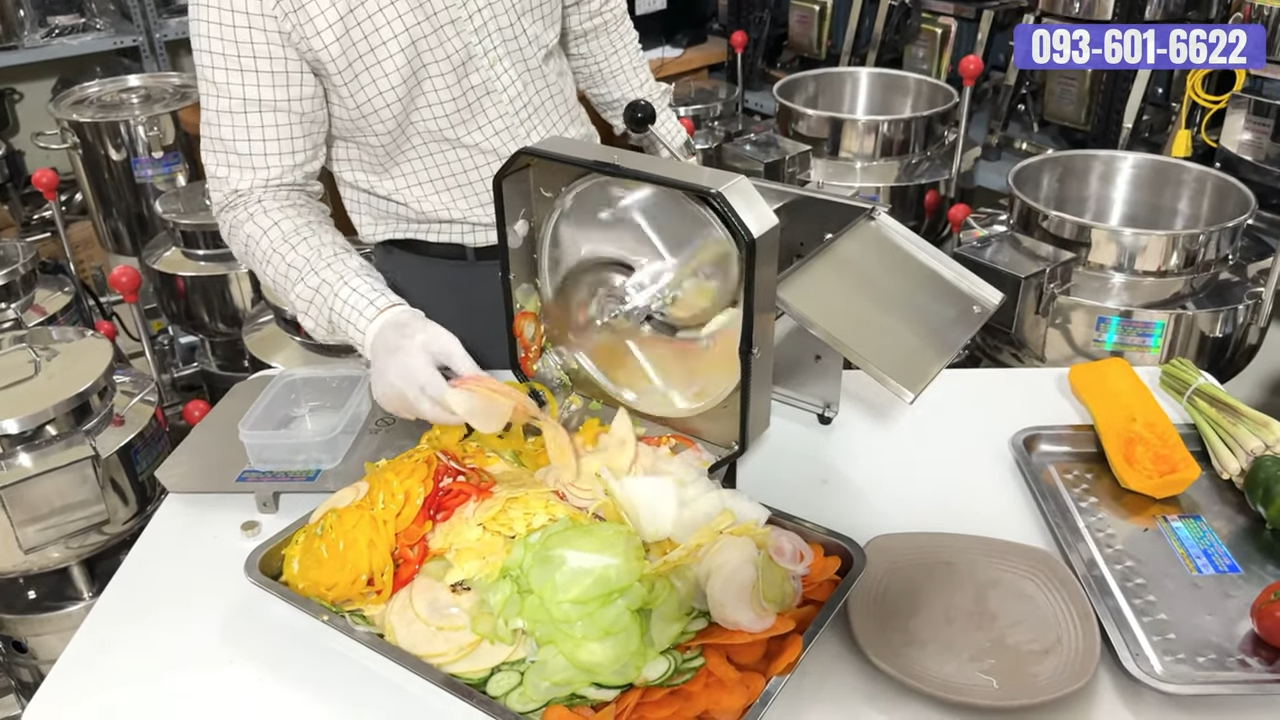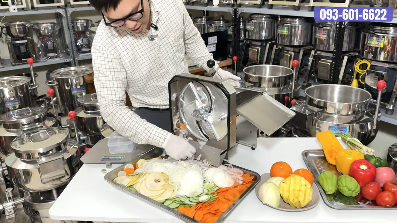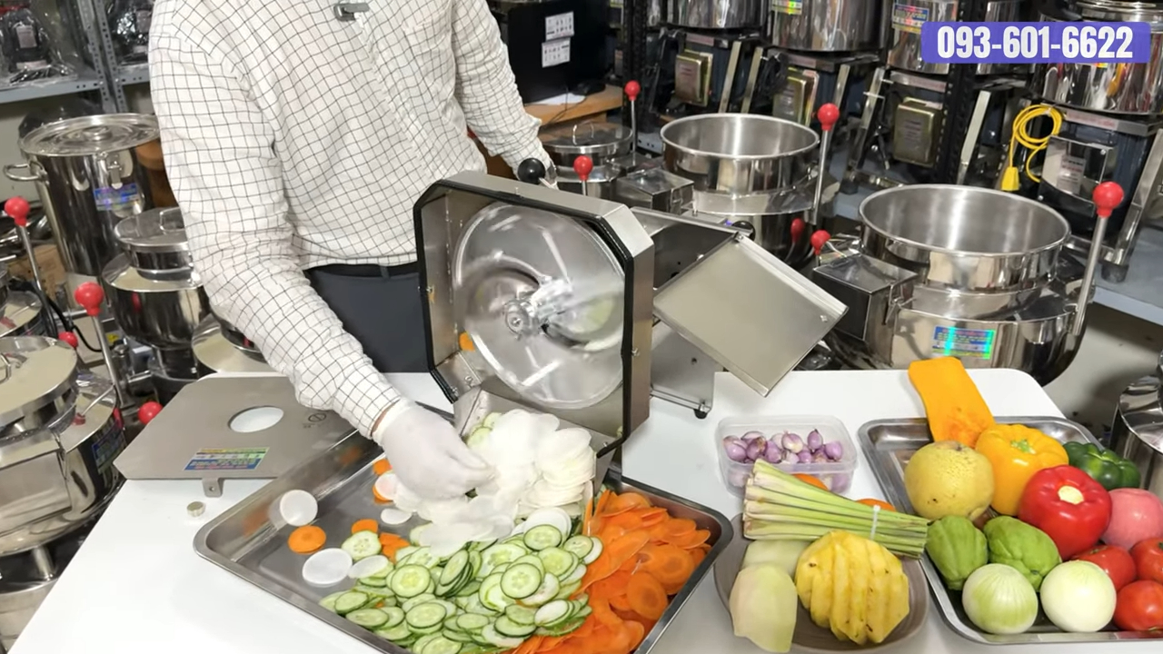 Ở đây chúng tôi đã chuẩn bị một số loại củ quả để thử nghiệm. Tất nhiên là không thể đầy đủ tất cả các loại, nhưng qua đó quý khách có thể thấy khả năng làm việc thực tế của máy. Quy trình sử dụng cũng rất đơn giản: chỉ cần cho nguyên liệu vào khay chứa phía trên, sau đó máy sẽ tự động thái lát nhanh chóng. Đặc biệt, máy cho phép điều chỉnh độ dày mỏng của lát cắt. Nếu muốn lát dày hơn thì chúng ta xoay núm điều chỉnh ngược chiều kim đồng hồ. Còn nếu muốn lát mỏng hơn thì xoay theo chiều kim đồng hồ. Nhờ vậy chúng ta có thể tạo ra nhiều độ dày khác nhau tùy theo mục đích chế biến.