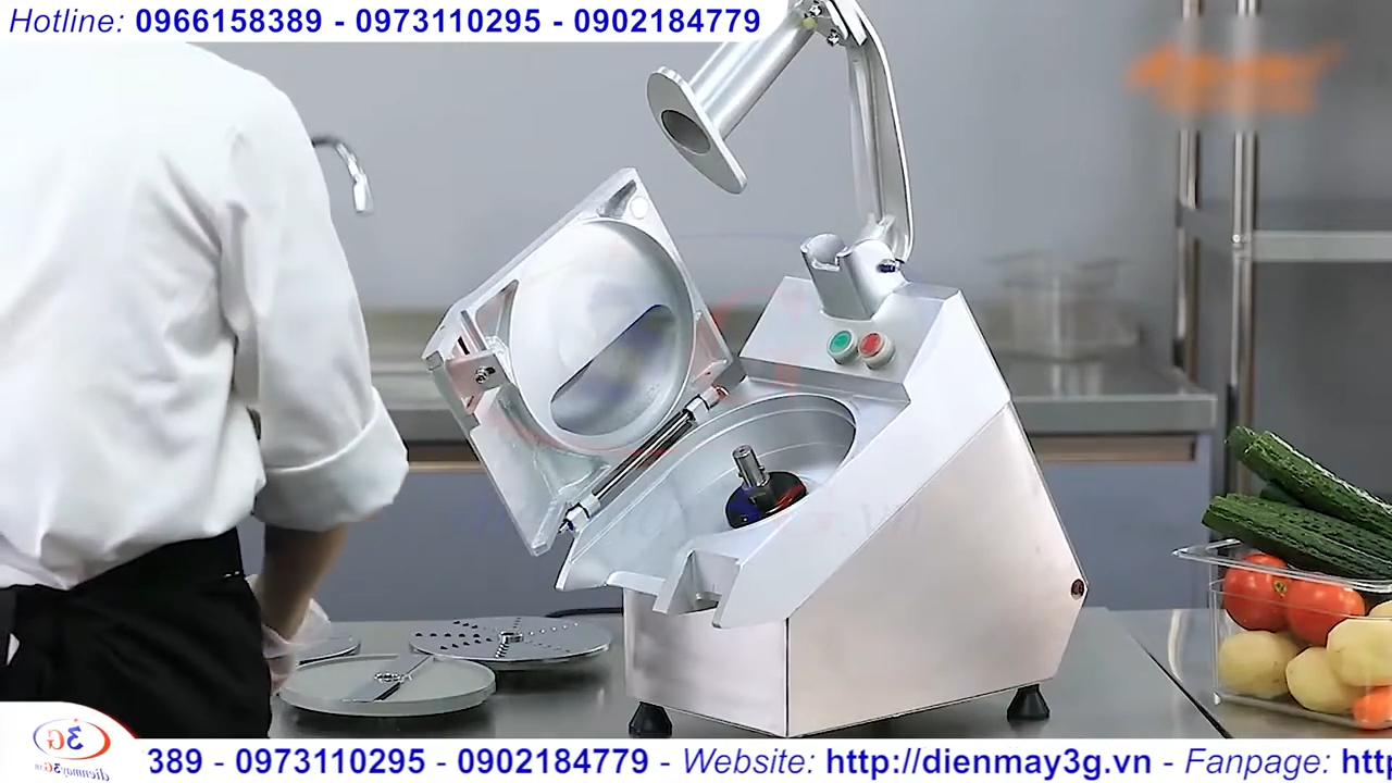 Phần nắp đậy của bộ cắt được thiết kế có chốt khóa chắc chắn, giúp quá trình thái rau củ an toàn và việc vệ sinh máy trở nên dễ dàng hơn. Khi nắp chưa đóng đúng vị trí, máy sẽ không thể hoạt động, đảm bảo an toàn cho người sử dụng. Máy đi kèm 5 bộ lưỡi dao, có thể tháo lắp dễ dàng. Các lưỡi dao được thiết kế chính xác giúp thành phẩm cắt đều, đẹp và hạn chế dập nát nguyên liệu.
