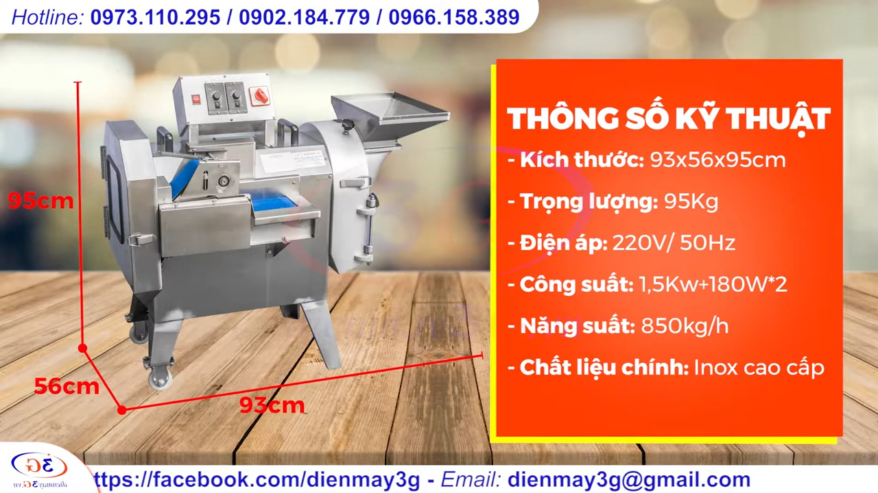 Về thông số kỹ thuật, máy có kích thước 93 x 56 x 95 cm, trọng lượng khoảng 95 kg. Điện áp sử dụng 220V – 50Hz, công suất 1,5 kW tương đương 1480W. Năng suất đạt khoảng 850 kg nguyên liệu mỗi giờ. Chất liệu chính của máy là inox cao cấp, đảm bảo độ bền và an toàn vệ sinh thực phẩm.